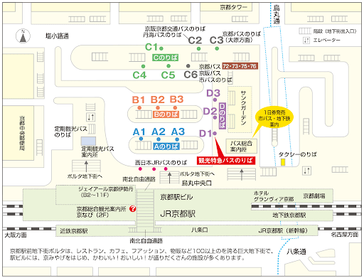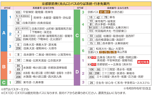 京都駅からバスで向かう場合、京都駅の中央口(京都タワーがある方)から外へ出て、駅のすぐそばにあるバス乗り場へ向かいます。