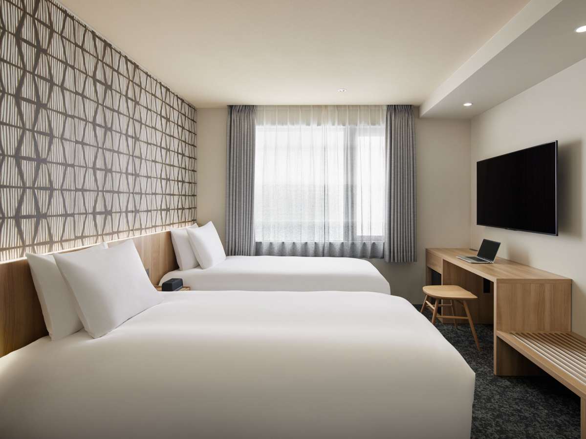 客室「モデレートダブル・ツイン」はデスクがないもののゆったり空間で利用可能。3〜4名グループは「コンパクトハリウッドツイン(コネクティング)」を2室予約し、内扉を開けて女子会などにもぴったり◎