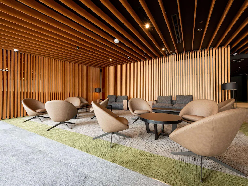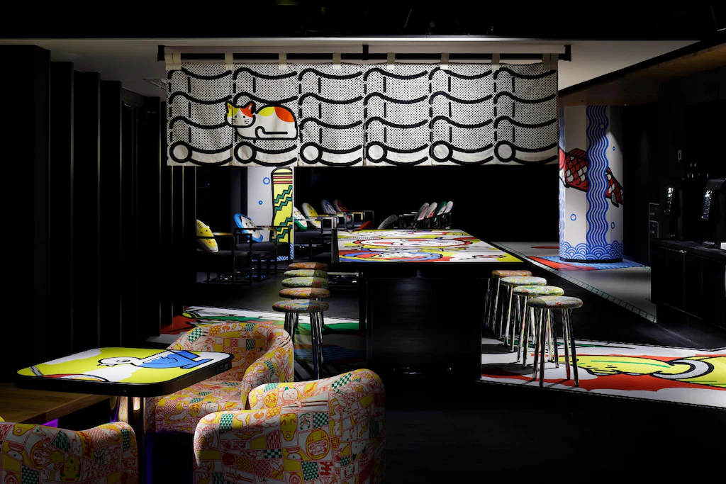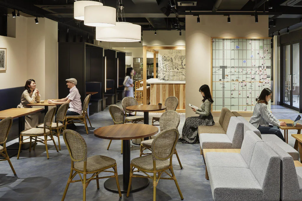 ホテルに入ってすぐのところにあるOMOベースには高瀬舟を模した高瀬舟テーブルが置かれ、その周囲にはボックス席など自由に使えるスペースが広がっています。