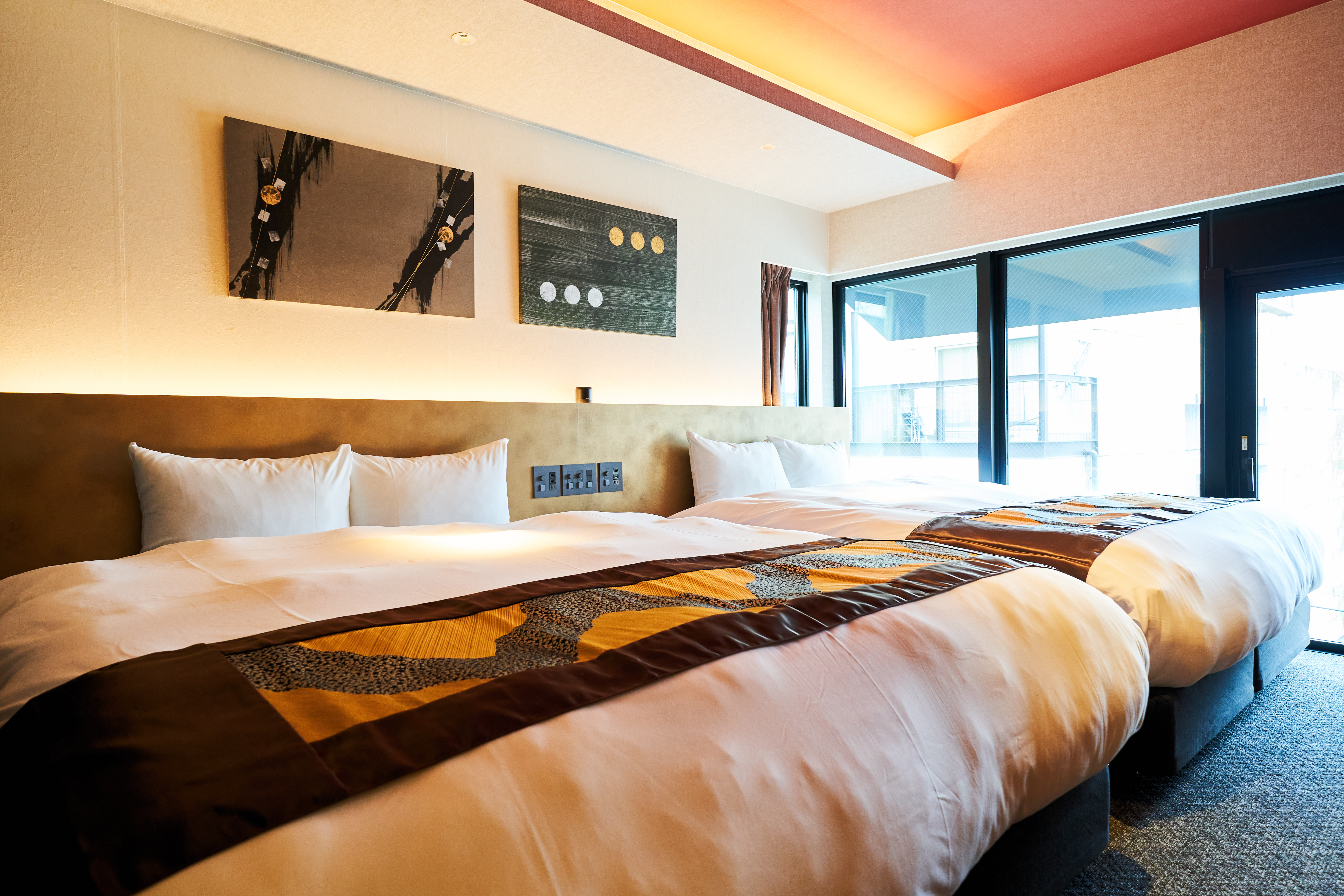 また客室内にも全室墨絵アートがさりげなく飾られ、手水鉢から着想を得たアウトベイシンスタイルの洗面台や、浄教寺の象徴である燈籠をモチーフにした照明が備わる和モダンなお部屋でのんびりと過ごせます。
