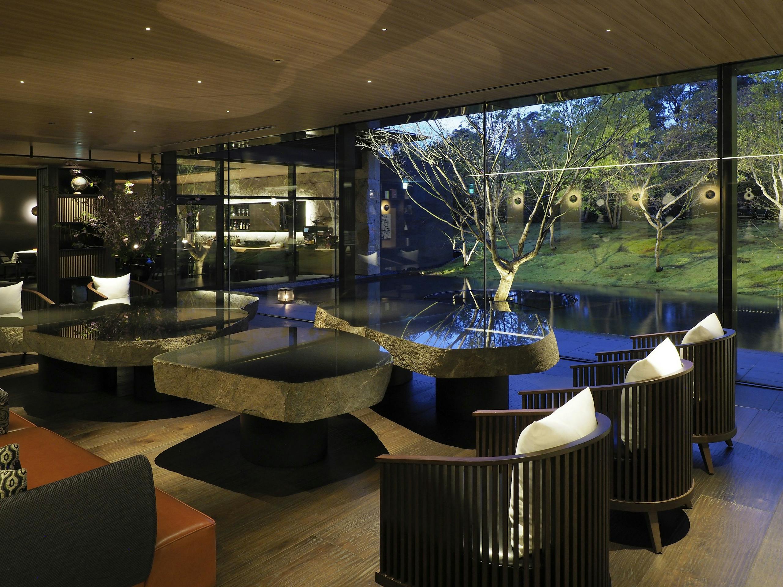 禅の心が感じられるロビーでは、玄武岩のテーブルに外の庭園の景色が映り込み、壁には古美術やお茶道具がディスプレイされていて、とても落ち着く空間が広がっています。