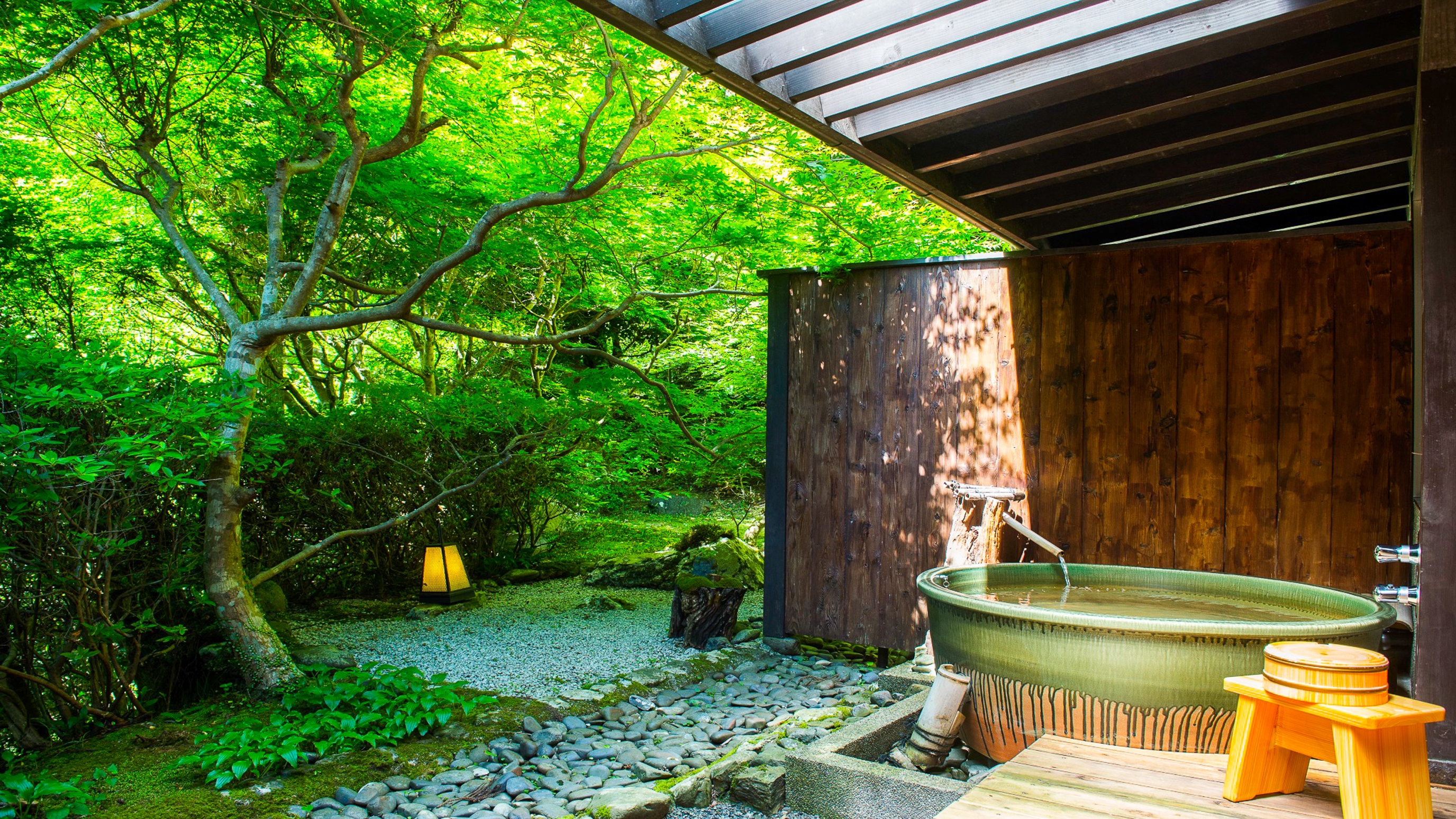 貸し切り温泉露天風呂「洛」と「庵」は、それぞれ専用の日本庭園を備え、ヒノキ框の露天風呂や風流な岩風呂でくつろぎの時間を味わえます。