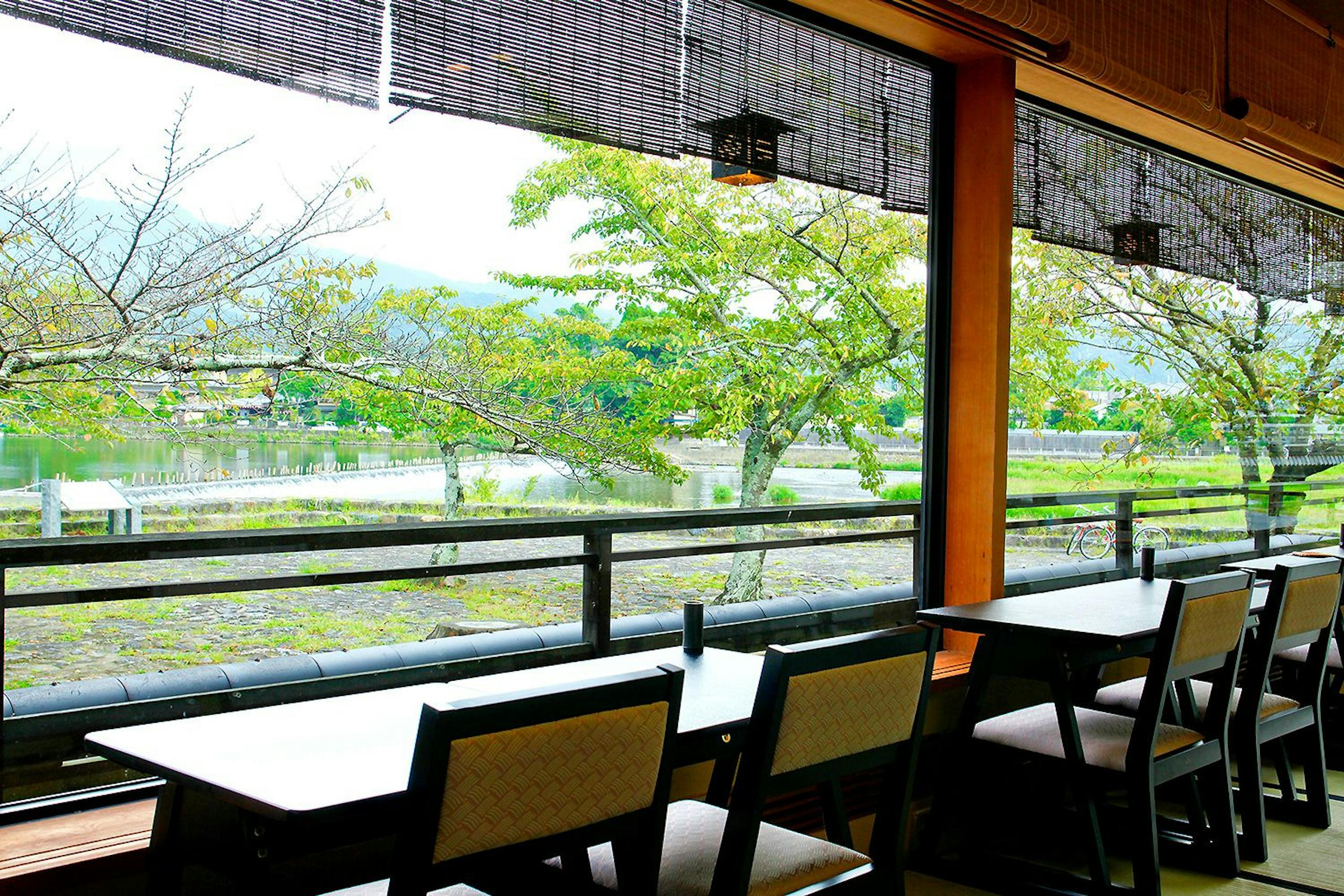 周辺は嵐山の厳しい景観保護規制下にあり、春は桜、夏は鵜飼、秋は紅葉など四季折々の風景を楽しむことができます。