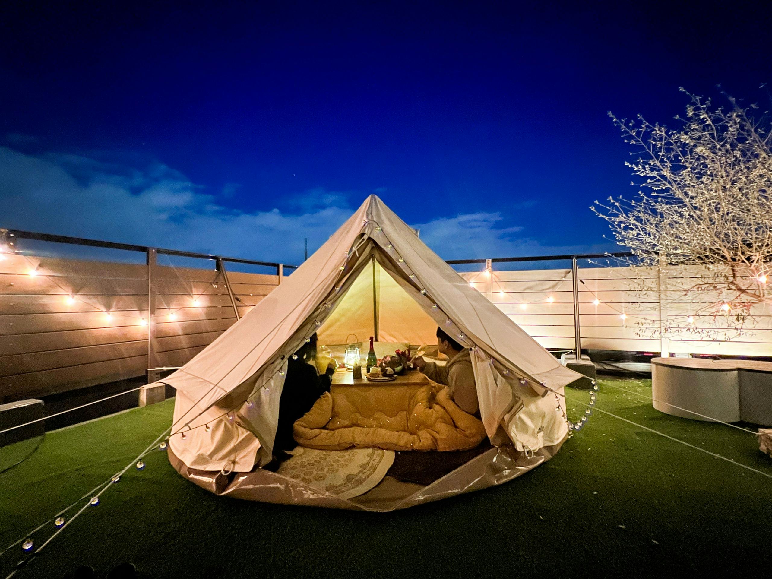 屋上にあるユニークなテントでグランピング気分。子供が喜ぶいつでも利用可能なフリースペース。