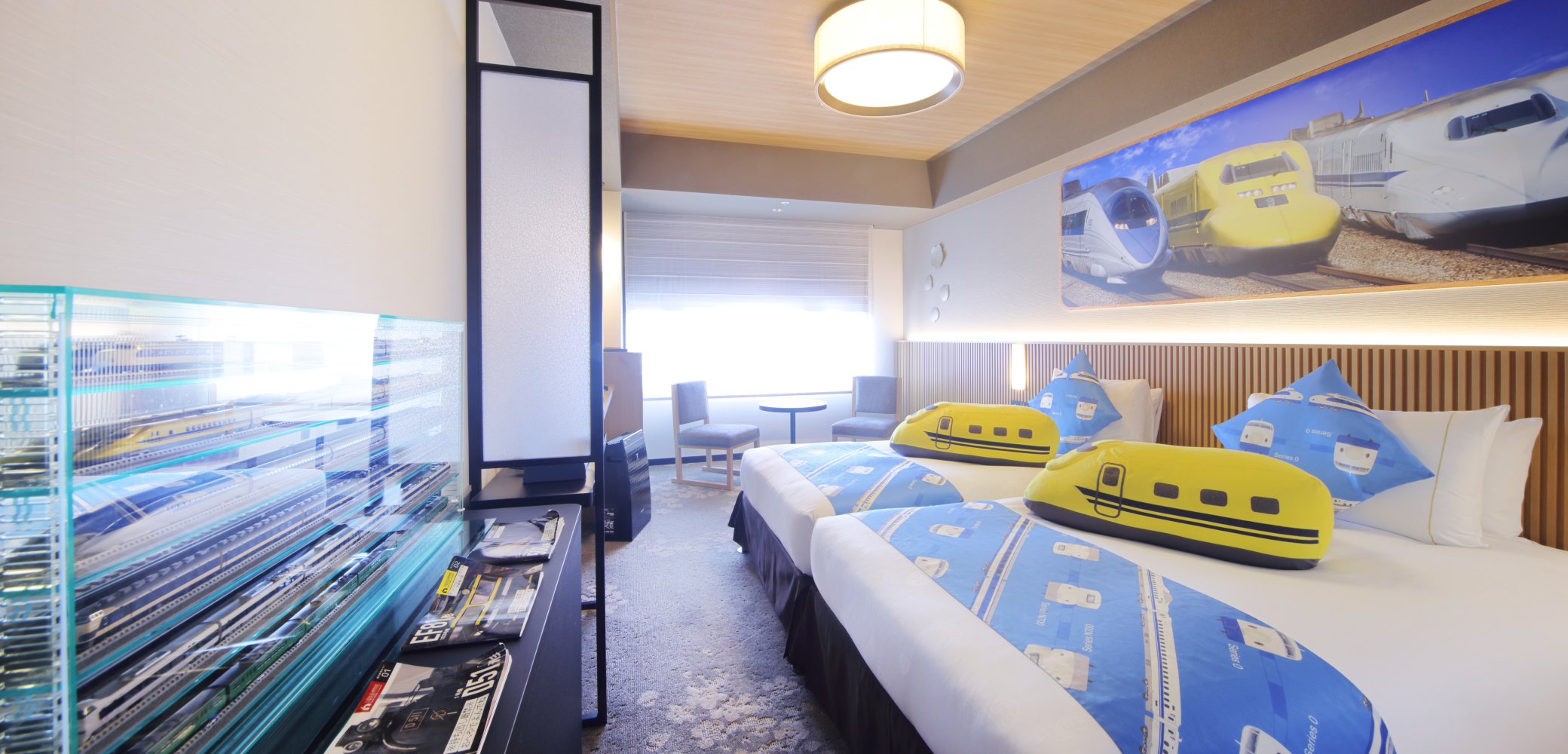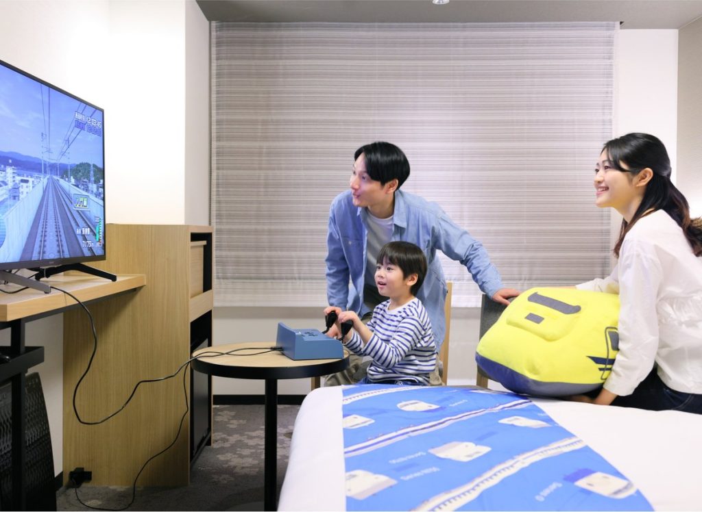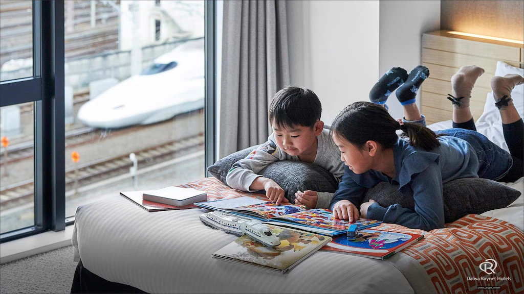 「トレインビュールーム」があり、部屋の窓から遮るものなく行き交う新幹線を眺められ、さらに「ドクターイエロールーム」や「新幹線ルーム」(トレインビュー可)も用意されており、特に鉄道好きの子供連れに大人気。小学生以下は添い寝OKで、家族の思い出作りにも最適◎