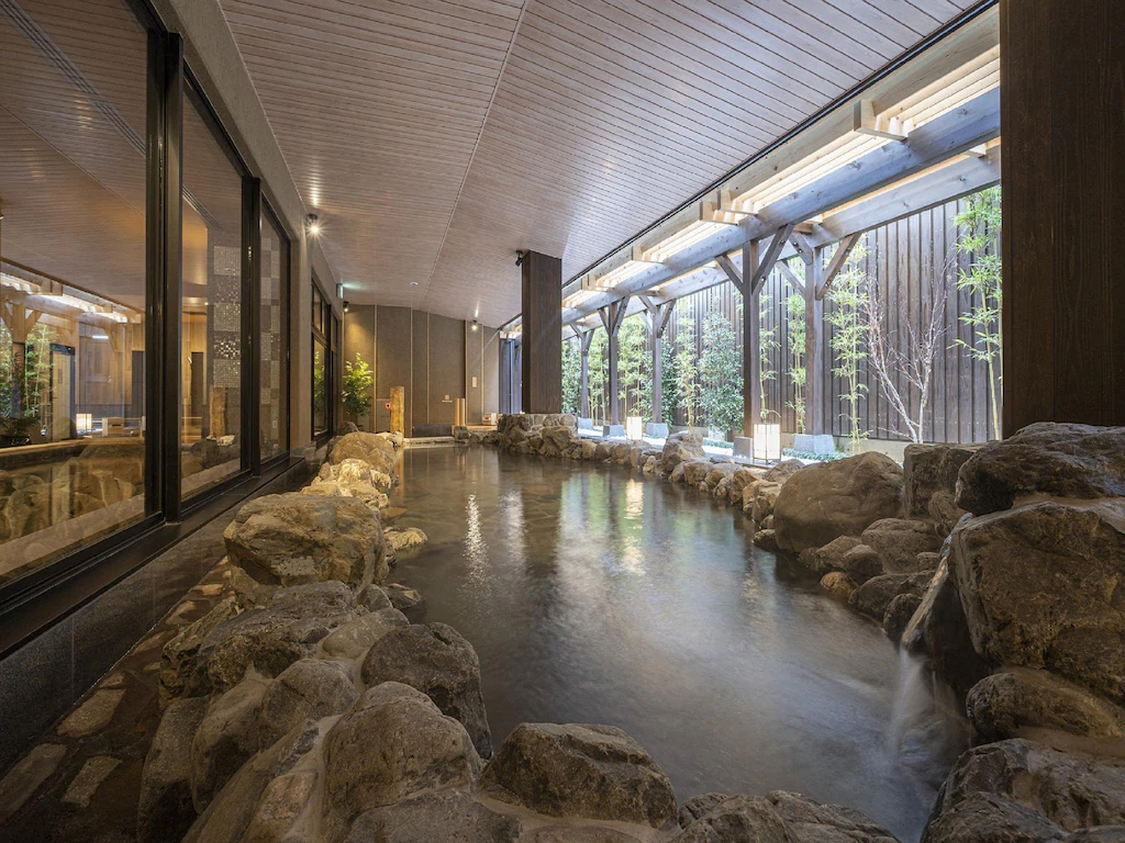 全長13.5mの広々とした天然温泉大浴場(サウナ完備)と、5つの無料貸切露天風呂が利用でき、湯巡りが楽しめます。 疲労回復や美肌効果のある温泉で、貸切風呂は数量限定の色浴衣と共にゆったり過ごせます。