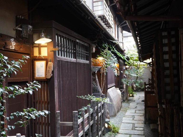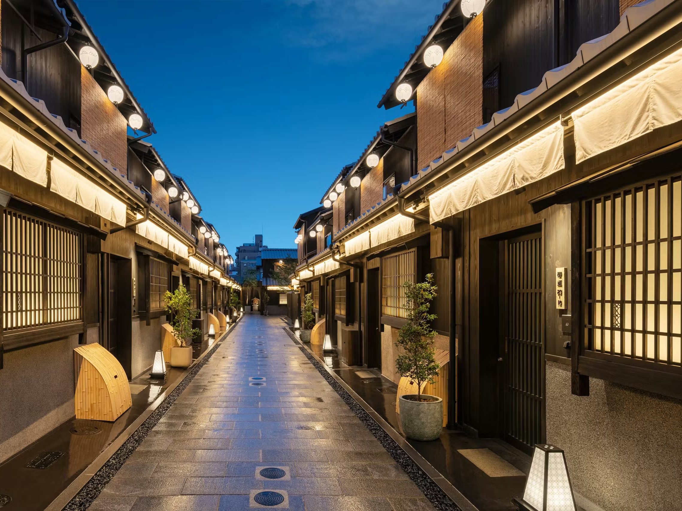 築110年以上の明治時代町家が並ぶ約1,400㎡のL字型路地全体をリノベーションした全23室のラグジュアリー旅館で、石畳の道沿いに風情ある町家が連なり、江戸の花街のような幻想的な雰囲気を味わえます。