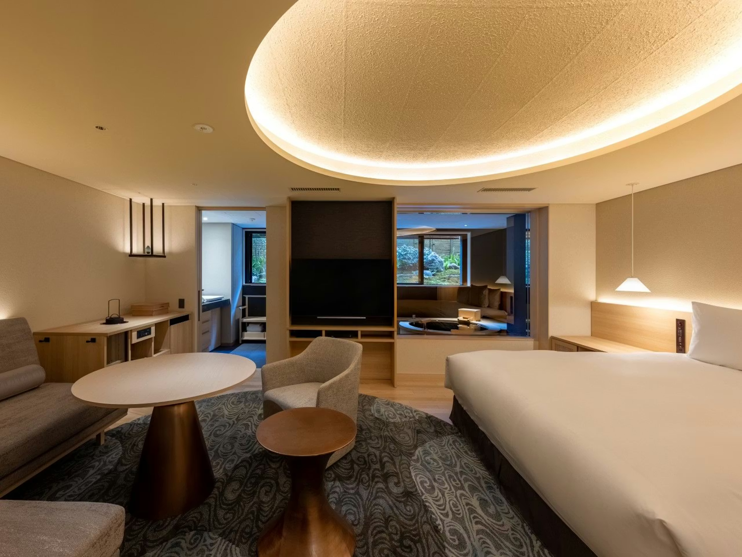 広々とした客室は天井が高くゆったりくつろげ、京都らしい上質なインテリアに囲まれたおしゃれで落ち着く空間でゆったり過ごせます。