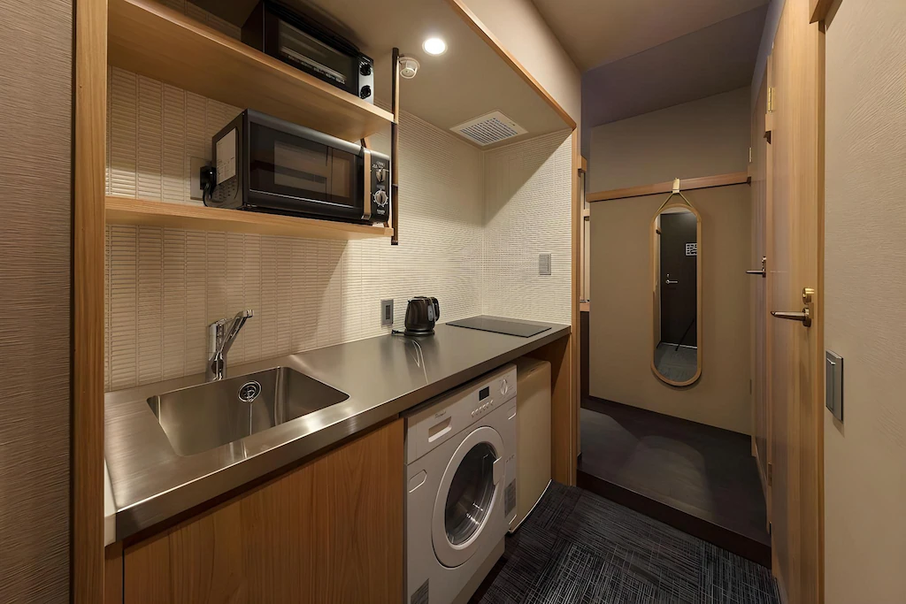 全部屋にキッチンや洗濯機を完備したサービスアパートメントタイプで、子供の食事作りやおむつ替え後の洗濯が部屋で簡単にでき、連泊や長期滞在にも便利。