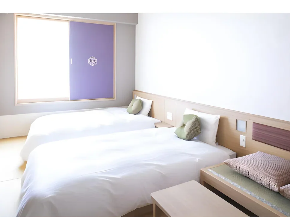 客室は京都の茶室をイメージした花や草木のモチーフで和の雰囲気に包まれ、全室に全米シェアNo.1のサータ社製ベッドを導入し、広々とした寝心地で旅の疲れをたっぷり癒せます。