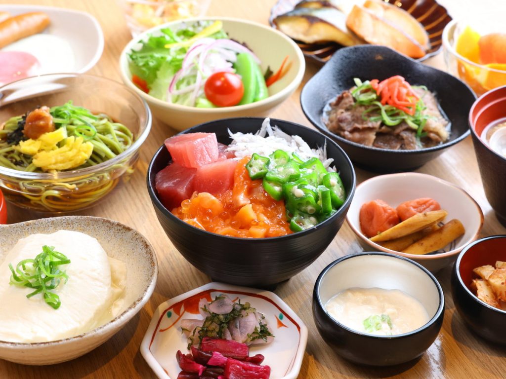 新鮮ないくらを含む4種類の海鮮具材が好きなだけかけ放題の海鮮丼が朝食で楽しめ、自分好みの豪華丼を朝から作れます。朝食バイキング(大人2,500円)は、京都らしい湯葉や京漬物、手作り京豆腐、宇治抹茶入り冷茶そばなどご当地メニューが充実しており、京都の朝を感じられます。