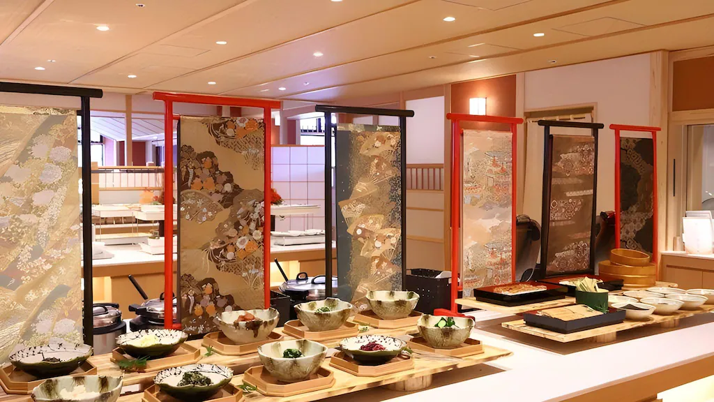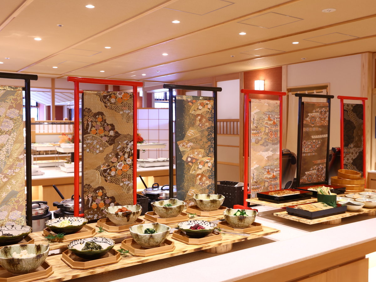 朝食バイキングが自慢で、約80種類の和洋メニューに新鮮な海鮮コーナーがあり、いくらをはじめとするネタを思う存分トッピングしてご飯にかけて食べ放題。京都の旬野菜やおばんざい、地酒も揃い、家族連れや女子旅に大人気。