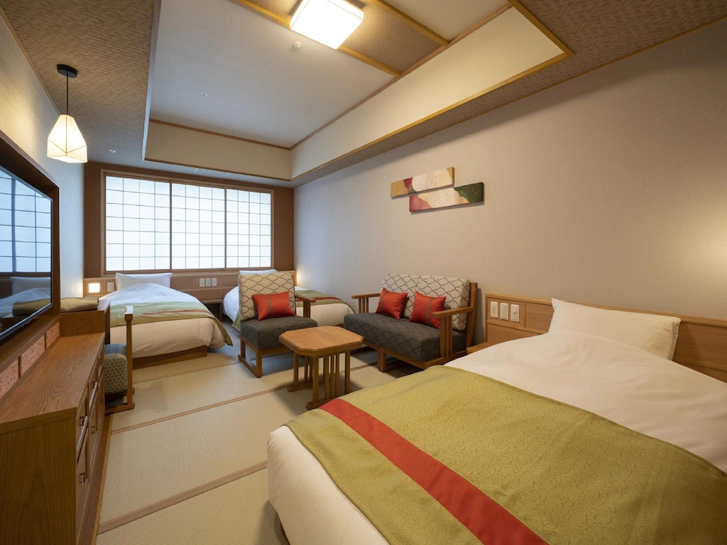 客室は全室海側で日本海の絶景が広がり、日本海の壮大なパノラマビュー。 8畳以上の和室とベッド付き洋室が繋がったレイアウトで、伝統的な畳の落ち着きとモダンな快適さを両立、リニューアルで清潔感もアップ。