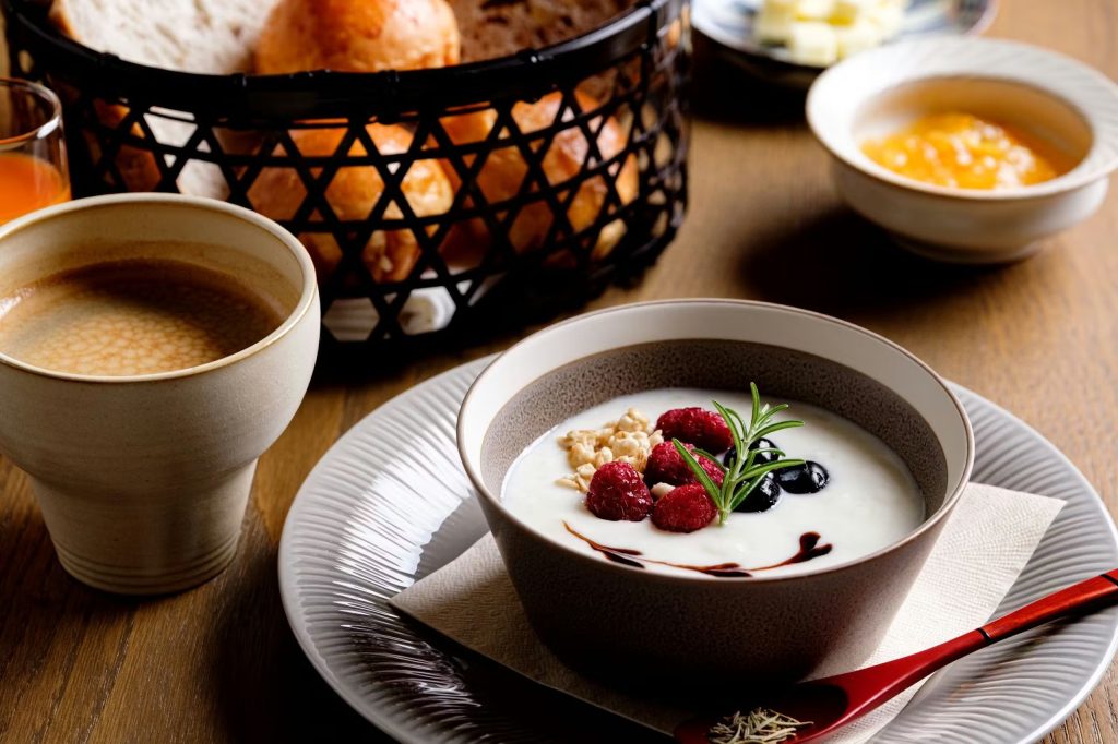 朝食は、手作りの温かみにあふれ、甘酒入りのヨーグルトにグラノーラとローズマリーのドライをトッピング、パンには手作りジャムが添えられます。かぼちゃスープも手作りで、トーストの後にチョコデニッシュがデザートとしてサーブされ、甘い締めくくりが楽しめますよ。