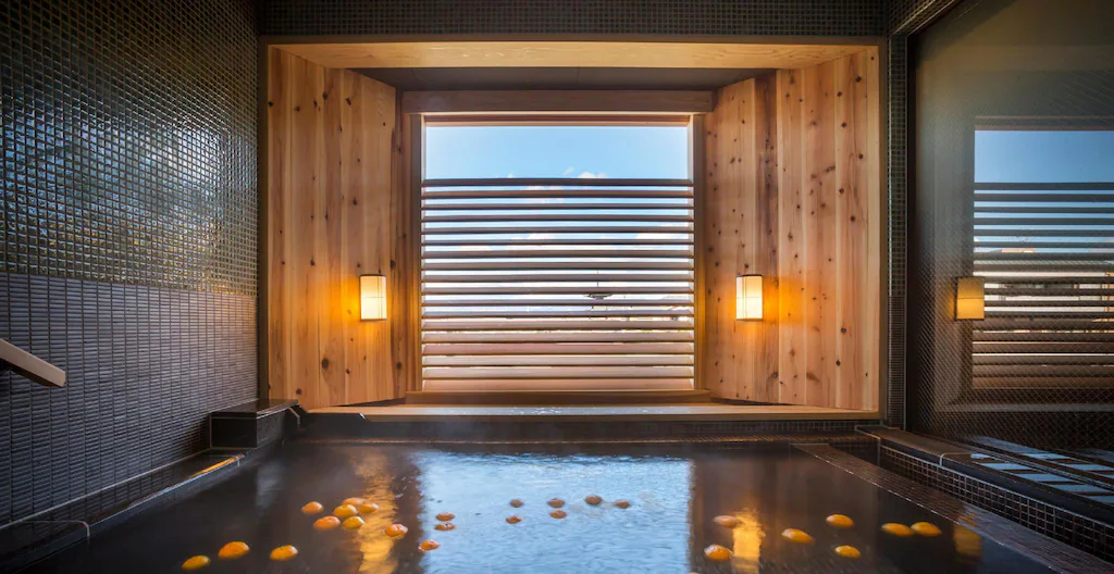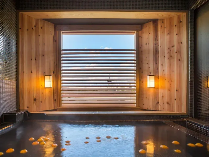 坂のホテル京都は、清水寺の参道である五条坂や清水坂など5つの坂に囲まれた東山エリアにあり、喧騒から離れた静かな空間が魅力。特に注目は、貸切風呂「蕩 八坂(tau-yasaka)」で、東山のシンボルである八坂の塔(五重塔)を浴室内から投げめられ、広々とした浴槽で「季節の暦湯」を楽しめます。