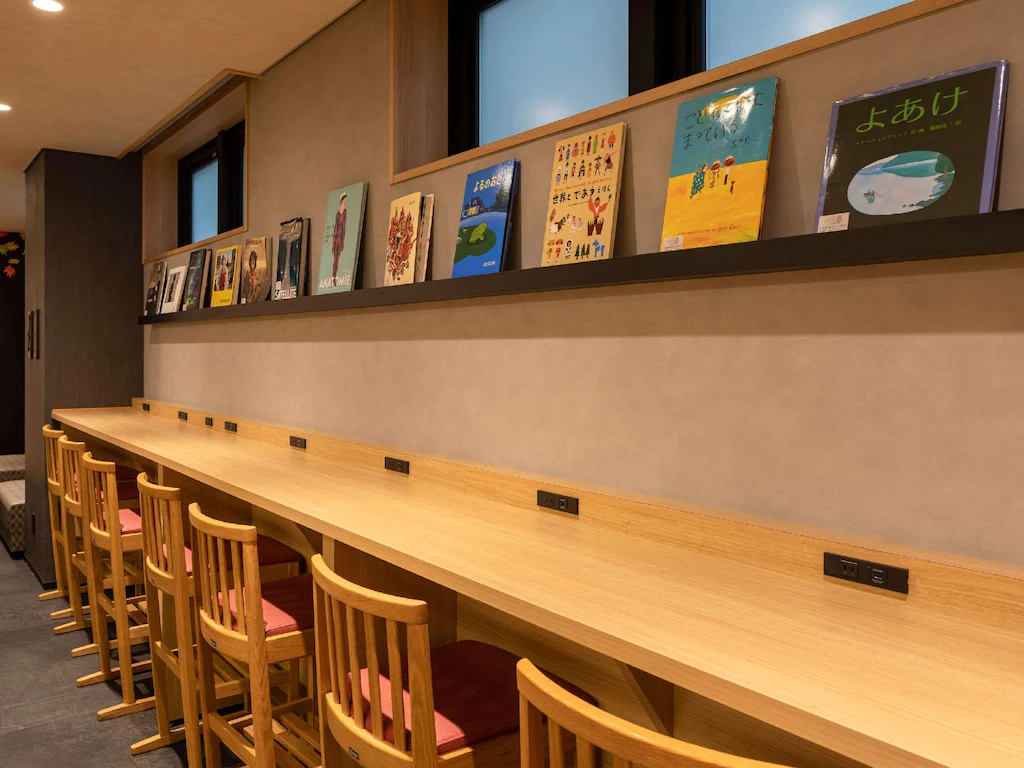 このカフェには、プロの選書家が「まちの来歴」や「旅の醍醐味」などのテーマに沿ってセレクトした、地域ゆかりの書籍や写真集など100冊以上の本が並び、宿泊者はチェックイン前やアウト後も自由に利用でき、無料で飲み放題のコーヒーや紅茶を片手に、開放的なソファ席や窓際のカウンターで心ゆくまで読書に没頭できます。