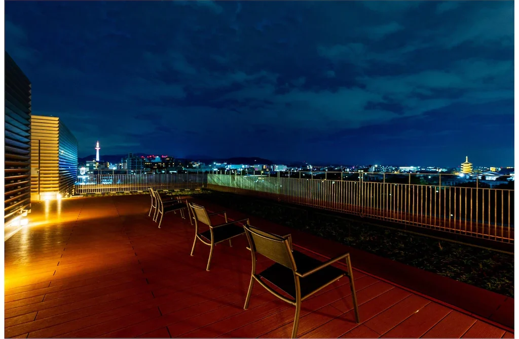 京都水族館のすぐ隣にある「梅小路ポテル京都」は、都会の喧騒を離れ、ルーフトップテラスからライトアップされた東寺の五重塔や行き交う電車の灯りをゆったりと眺められる穴場スポット。きらびやかな高層階からの景色とは一味違う、京都らしい情緒と開放感に満ちた夜景が自慢。さらに、宿泊者専用テラスやアルコール・ソフトドリンクも楽しめるフリーラウンジが充実しているため、お酒を片手に自分たちだけの贅沢な夜を過ごしたい方に最適◎