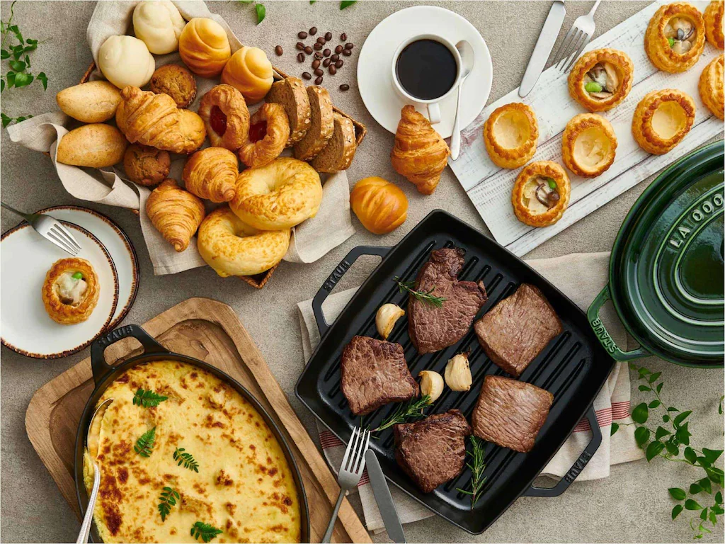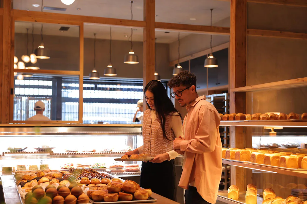 朝食は、1階のベーカリーから漂う焼きたてパンの香りで幸せな一日が始まります。メインを選べるプレートに加えて、種類豊富なパンや新鮮なサラダをブッフェ形式で楽しめ、そのクオリティの高さは朝から気分を上げてくれます。
